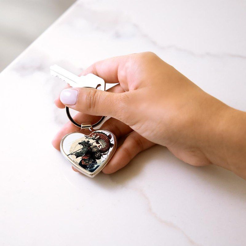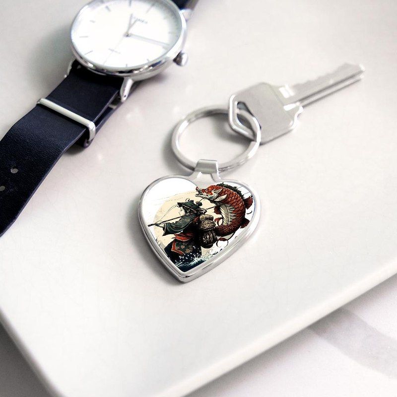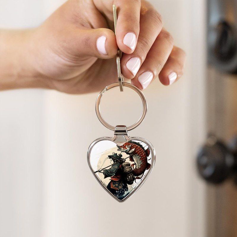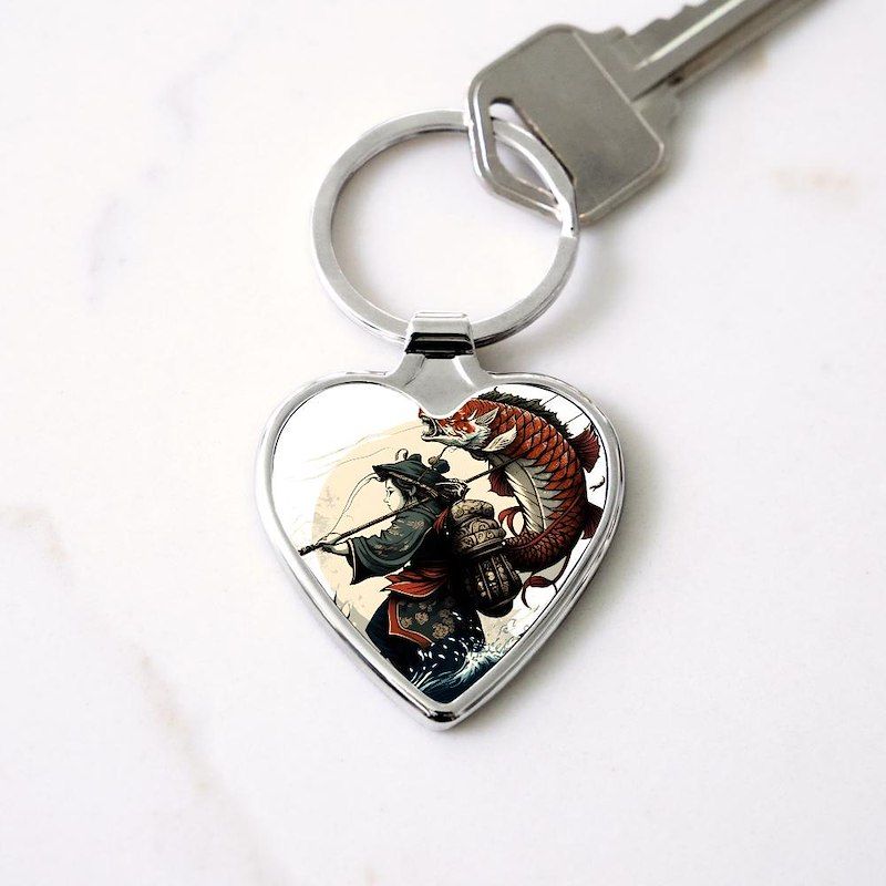 Japanese warrior catches a large fish Heart Keychain
